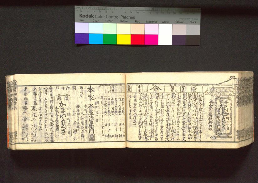 私店艾之儀者万治二己亥年より相始め江州伊吹山正真陳熟艾者他家無類にて則功能包紙に相記し売弘来候処近年私家名かまや艾之名目にて紛敷似せ物すでに同町に一軒同二丁目に二軒是等を始其外所々に数多御座候得共本家釜屋艾と申ハ私店一軒にて外に無御座候間何卒御用之節者小網町三丁目本家かまや治左衛門と家名能々御吟味之上不相替御用向被仰付被下候様偏ニ奉希候所々に似せ艾数多出来仕候に付為念如斯御座候以上 極上袋艾直段付