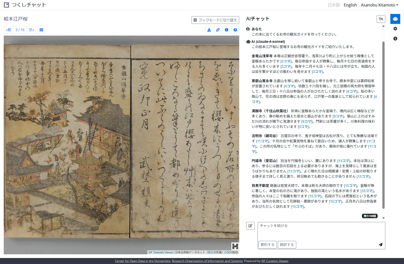 上の図は、IIIF Tsukushi Viewerに『絵本江戸桜』を表示し、本全体コンテキストを対象に、「この本に出てくるお寺の観光ガイドを作ってください」とプロンプトを入力した結果です。本のテキスト(古文)からプロンプトに関連するページを検索し、それをもとにガイド風の文章を生成しています。元の古典籍が昔の日本語(古文)で書かれているにもかかわらず、入力(プロンプト)にも出力(回答)にも現代日本語が使えるというのが、生成AIチャットの大きなメリットです。